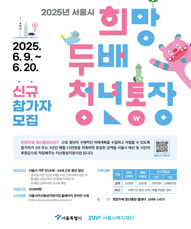 '희망 두배 청년통장'은 서울시가 주관하는 자산 형성 지원 사업으로, 일하는 청년이 매달 일정 금액을 저축하면 서울시가 같은 금액을 추가로 적립해 주는 매칭형 저축 제도예요. 예를 들어, 매달 10만 원을 3년간 저축하면 본인 적립금 360만 원에 서울시 매칭금 360만 원이 더해져 총 720만 원을 받을 수 있는 거죠. 단순한 저축이 아니라, 자립을 위한 튼튼한 디딤돌이 되는 제도랍니다.